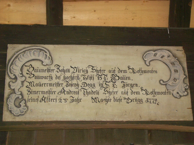 Erbaut 1779 von Johan Ulrich Schefer von Rotmonten, Bauwart des Klosters St. Gallen, nach Zerstörung durch Hochwasser wie in 1636 und 1723. |